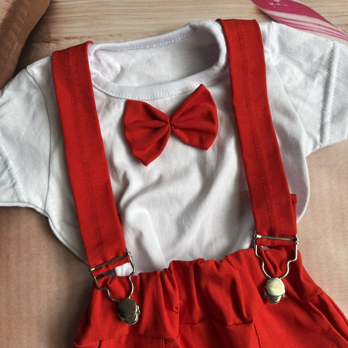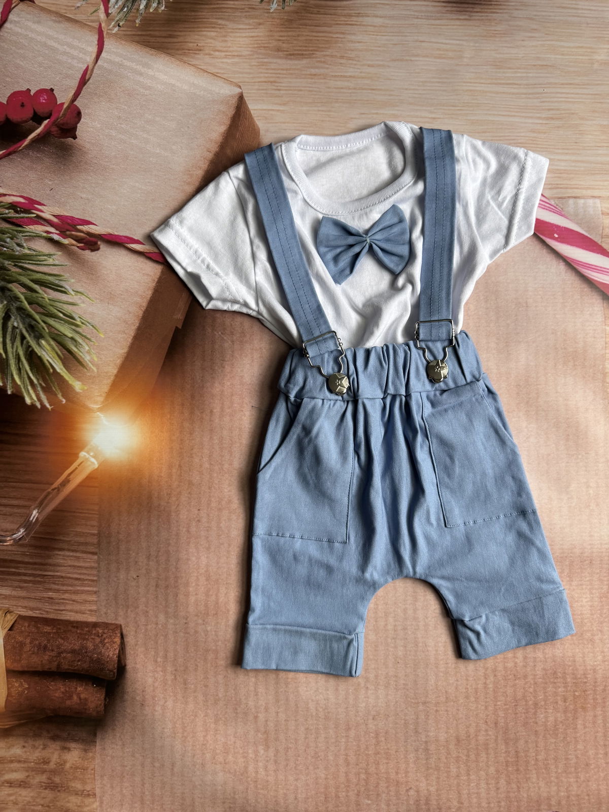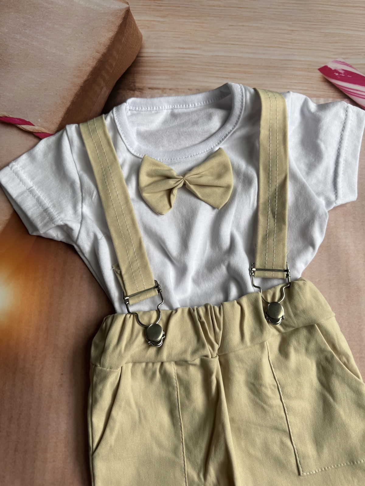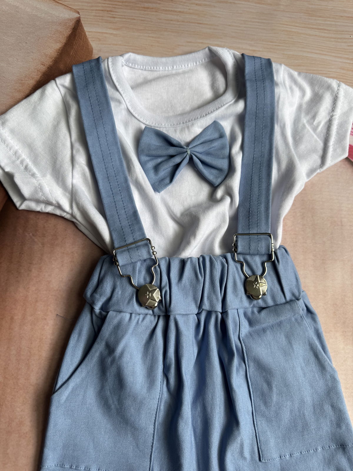 remera con mo帽o y short con tirantes